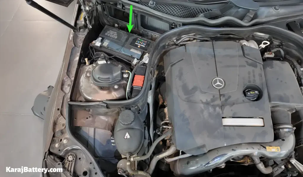 باتری بیشتر مدلهای بنز کلاس E، در محفظه موتور قرار گرفته است. با این حال در برخی مدلها مثل (بنز E280) باتری در زیر کفی صندوق عقب خودرو جانمایی شده است. در تصاویر زیر محل نصب باتری در بنز کلاس E را مشاهده میکنید.